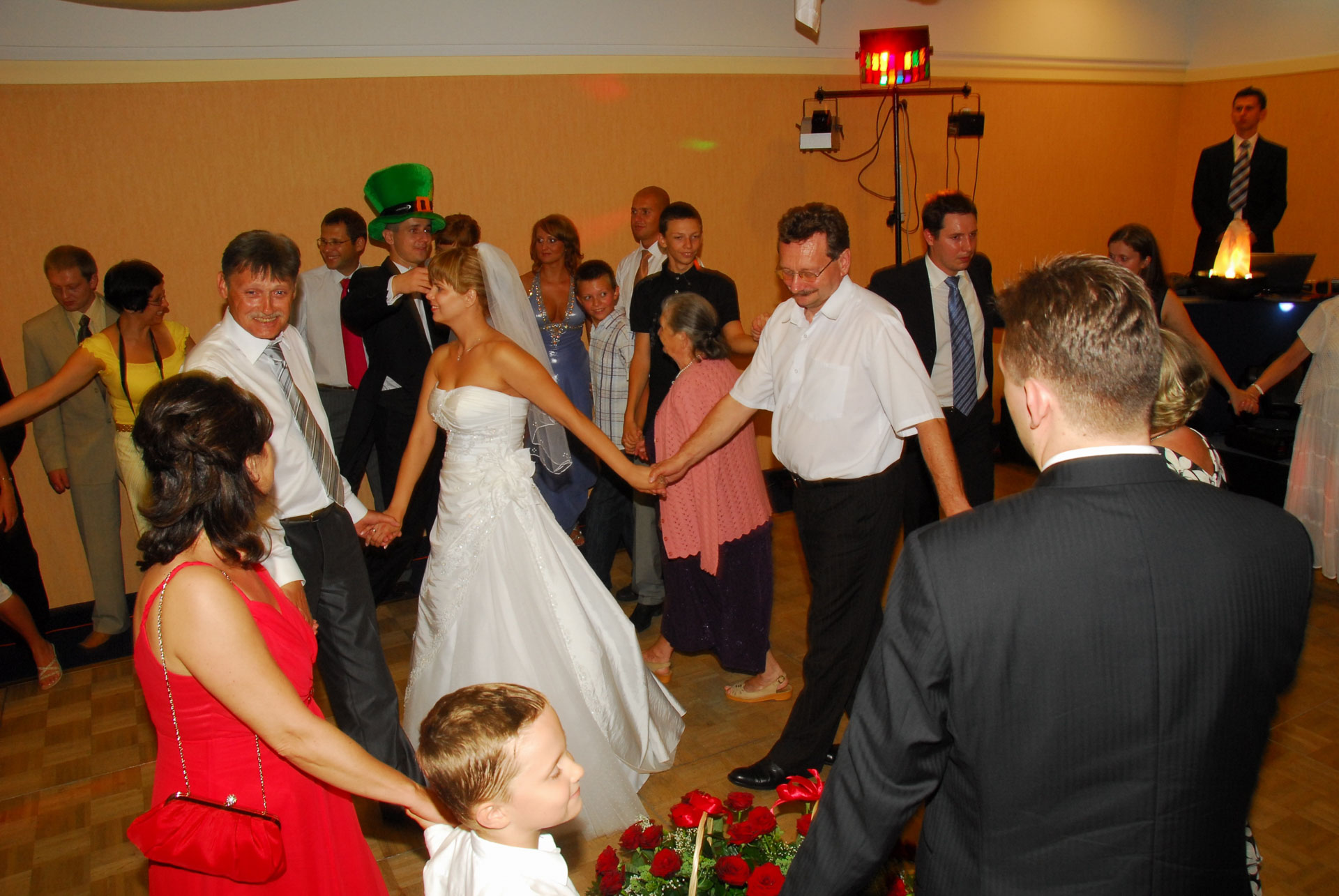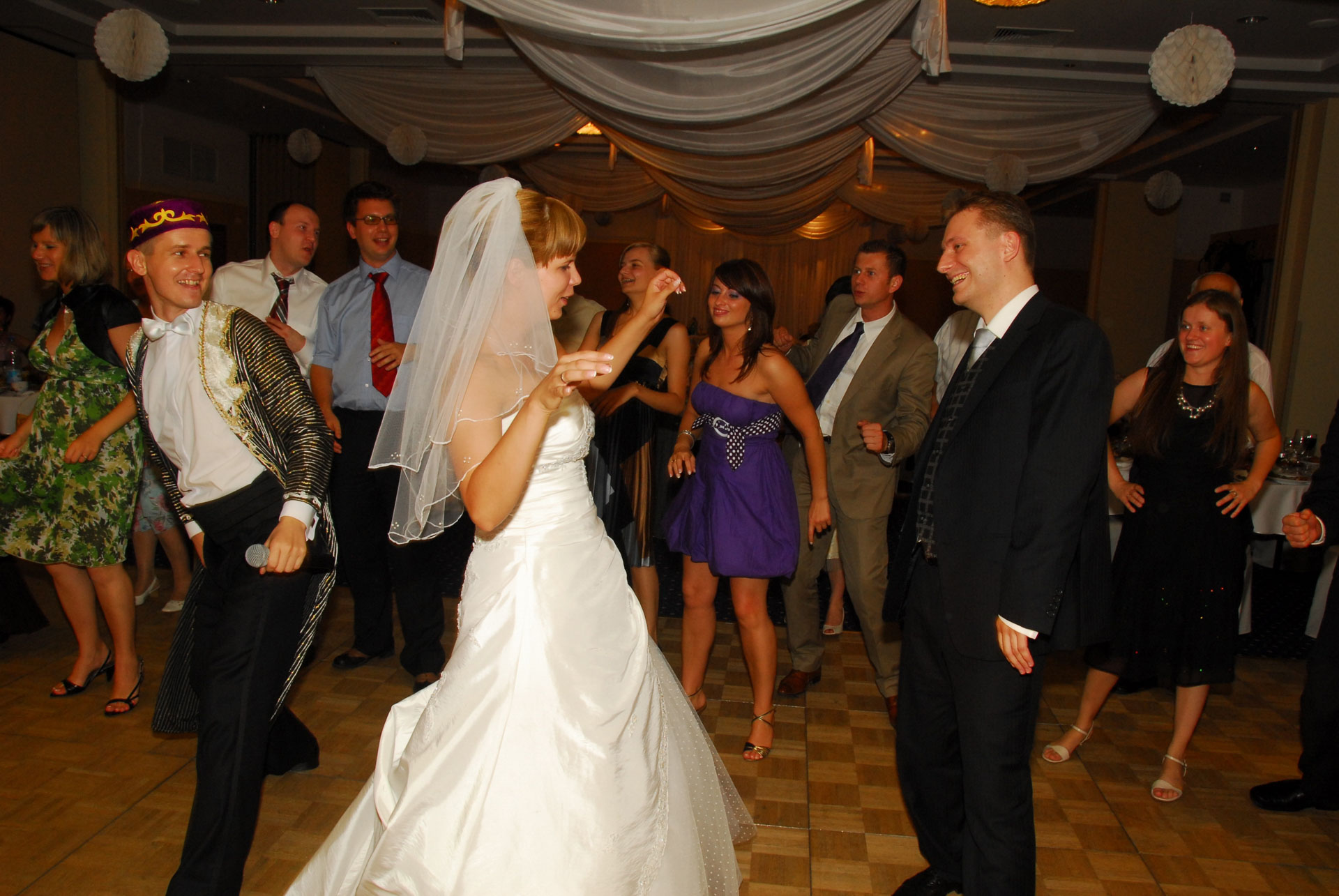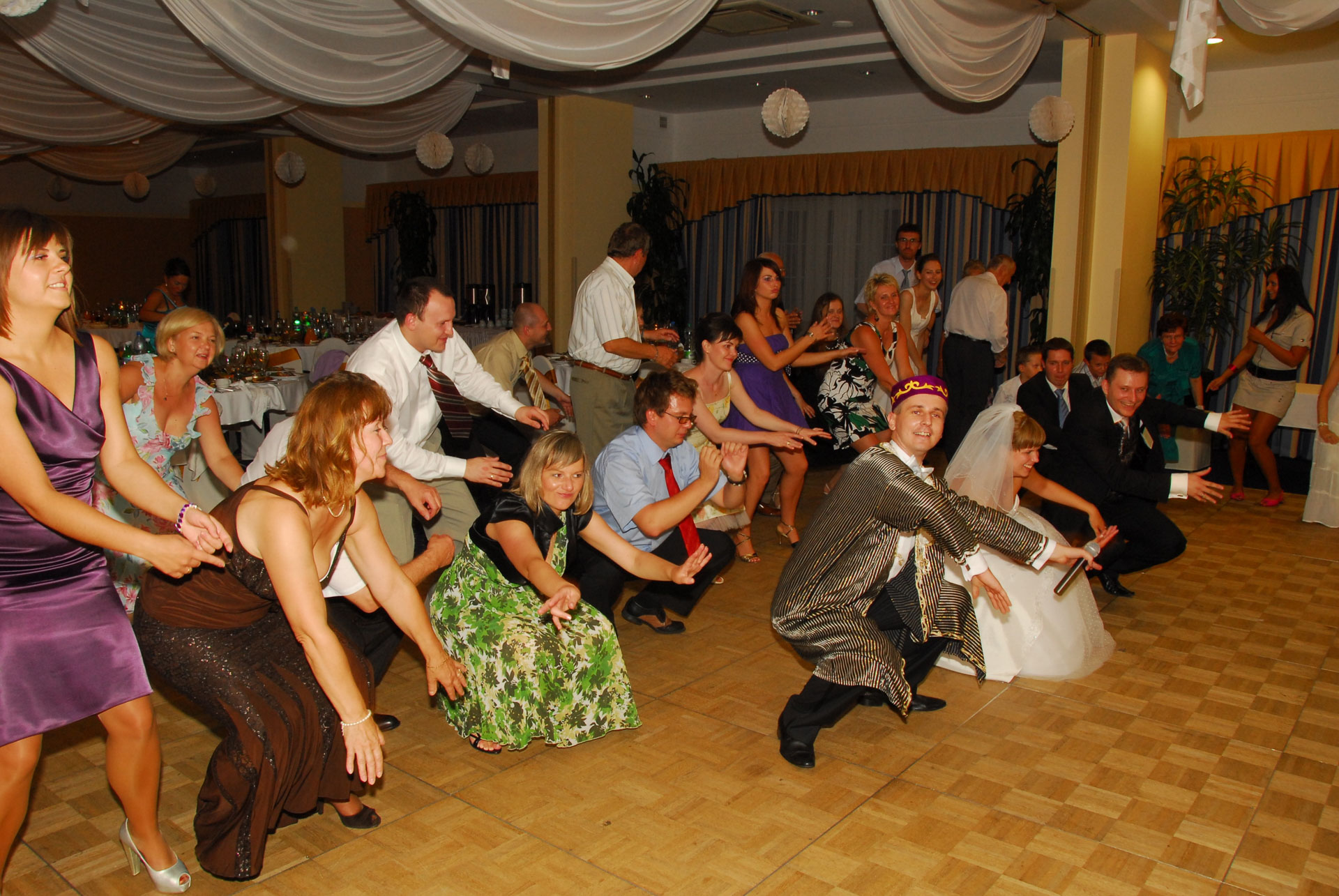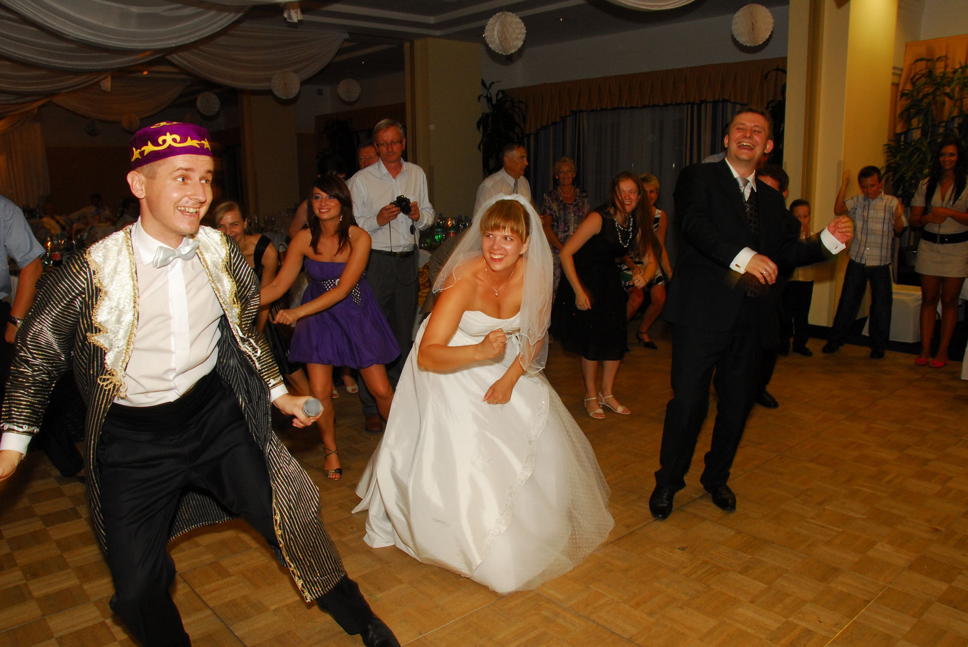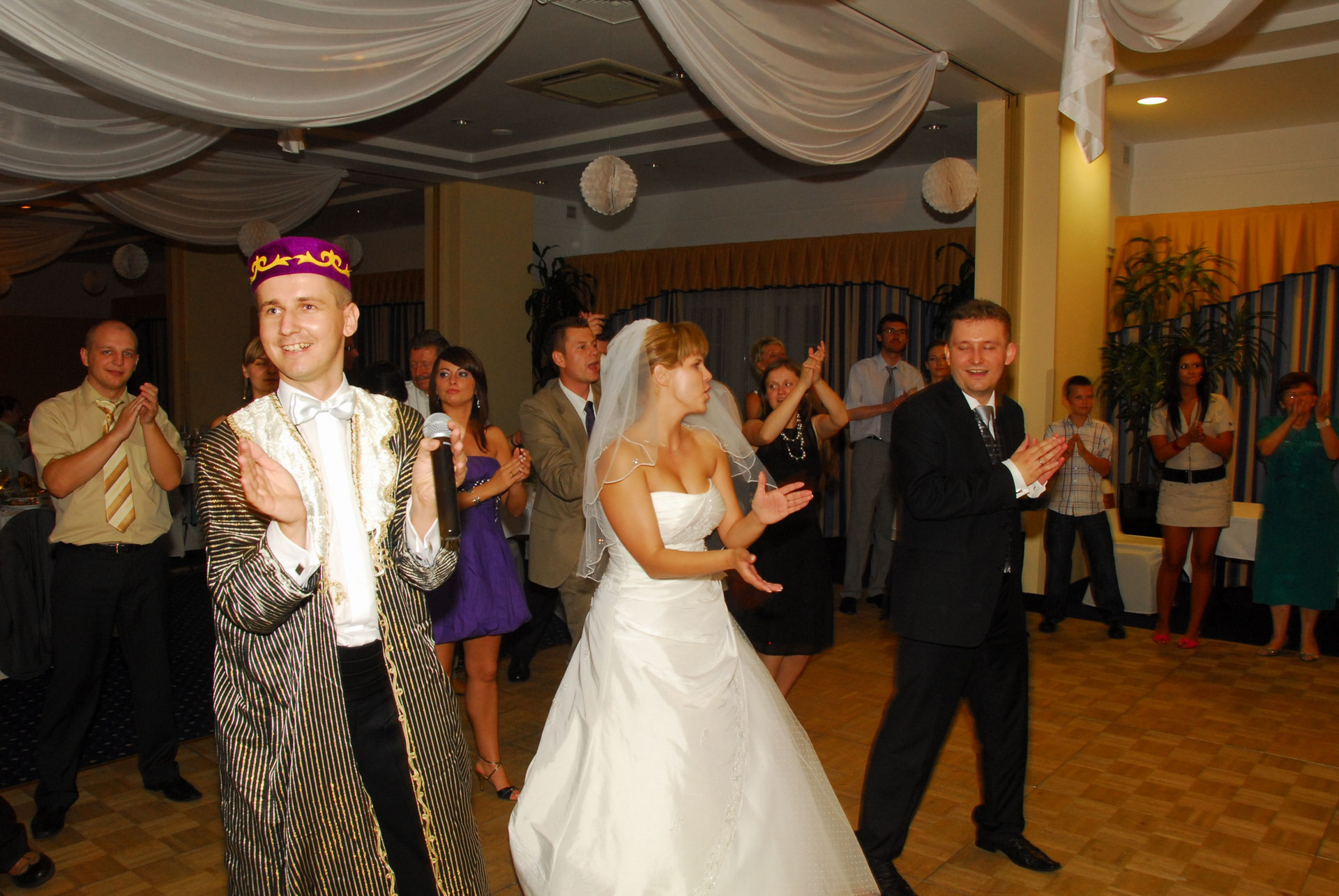 Polonez – narodowy polski taniec – prowadzony przez wodzireja Karpika na weselu