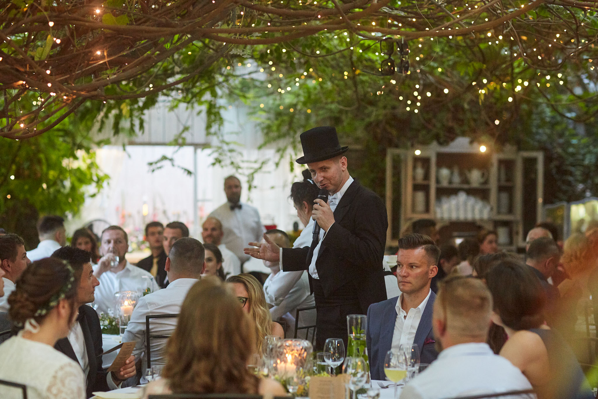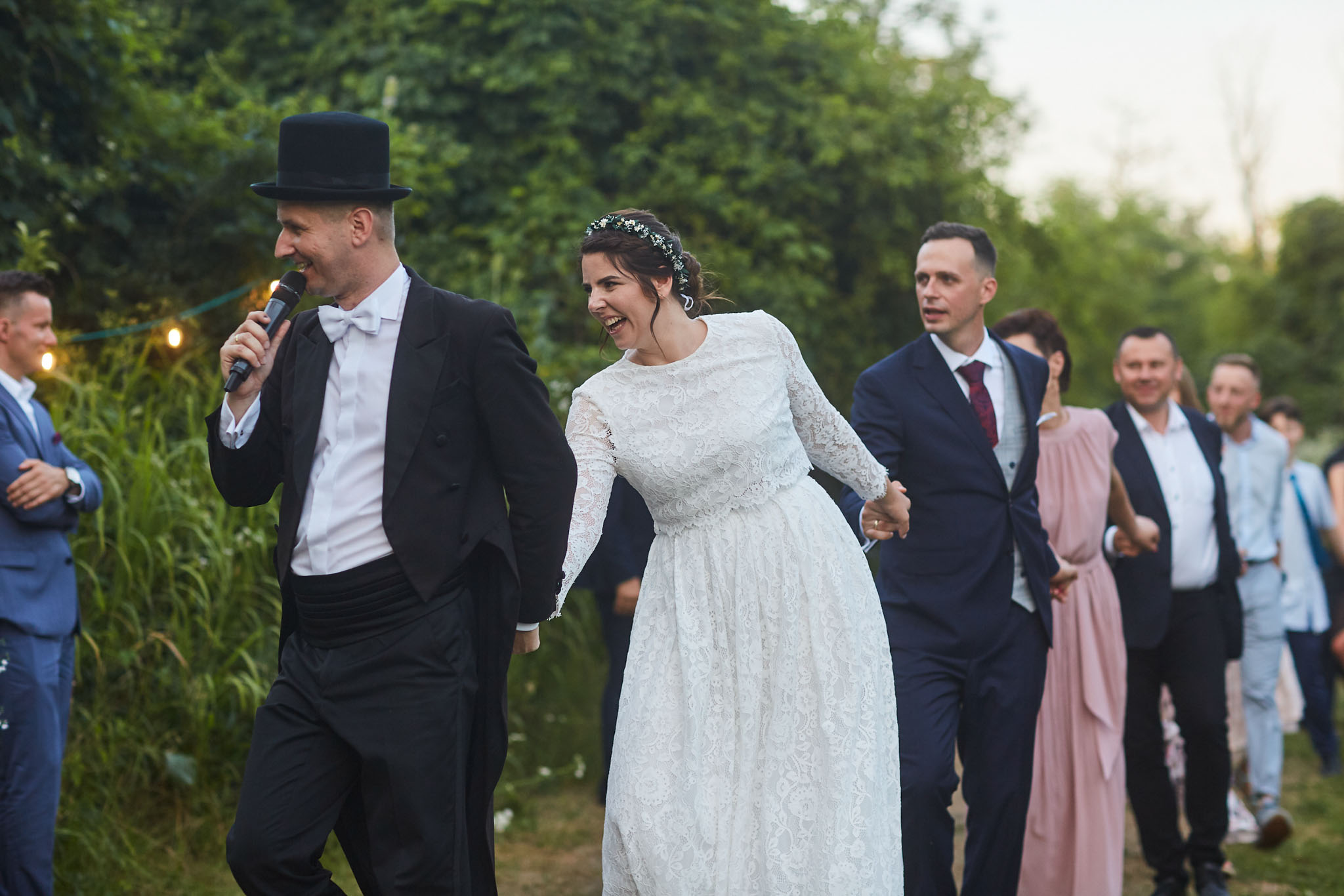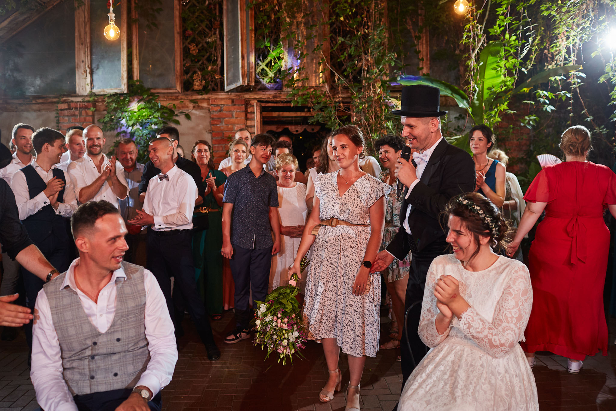 Stara Oranżeria to miejsce o niezwykle funkcjonalnym układzie – część taneczna jest oddzielona od strefy jadalnej, a tuż obok znajduje się piękny ogród z trawnikiem, który doskonale wkomponował się w przebieg wesela. Postanowiliśmy w pełni wykorzystać potencjał tej przestrzeni – nagłośniliśmy wszystkie strefy i płynnie przechodziliśmy z gośćmi między nimi, tworząc spójną, harmonijną całość. Ta forma prowadzenia wesela pozwoliła na jeszcze większą interakcję i zaangażowanie uczestników.