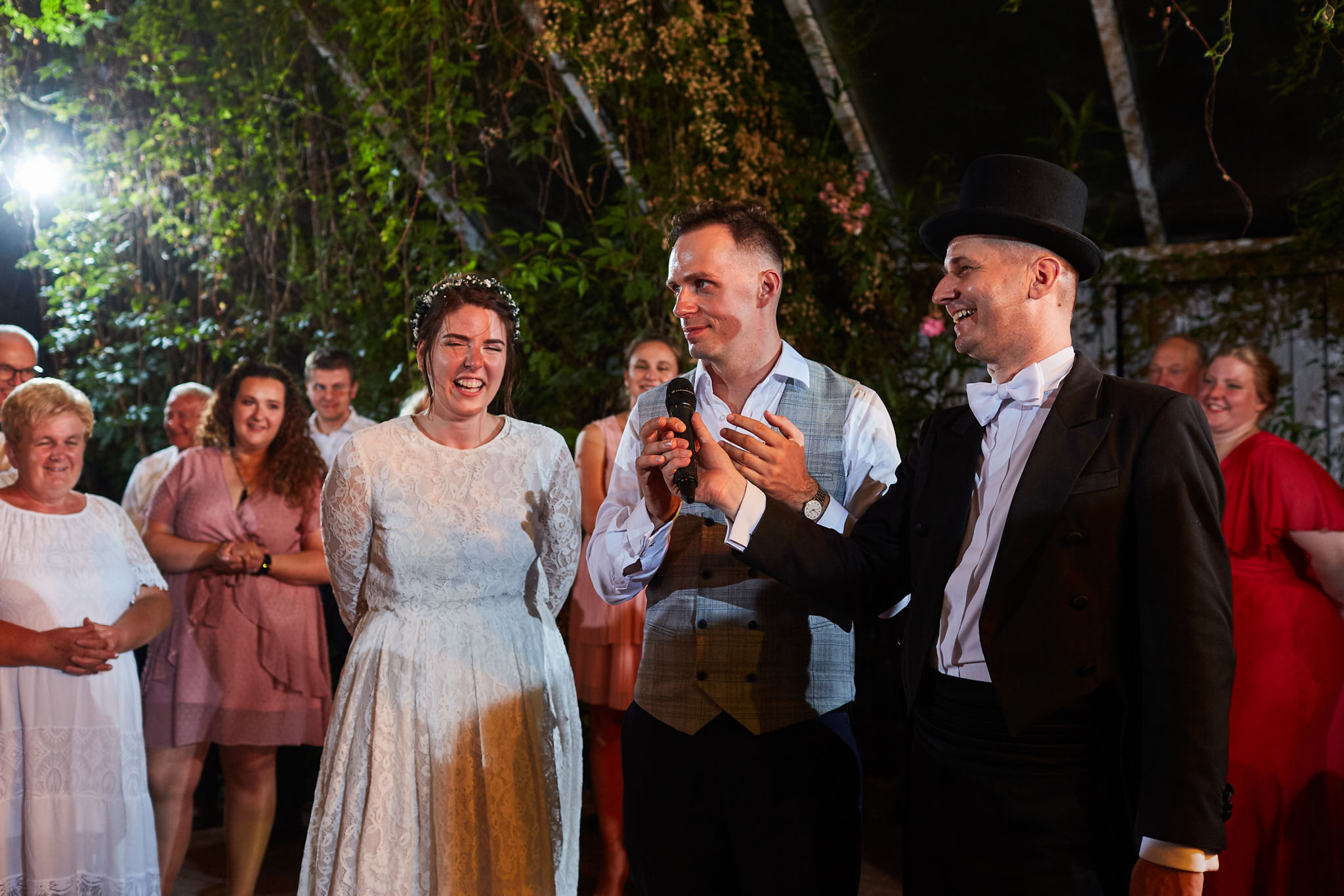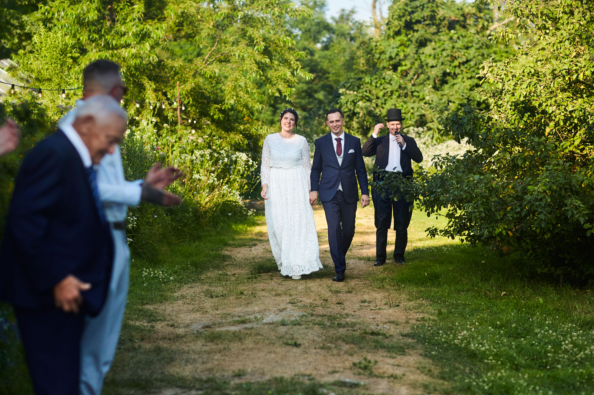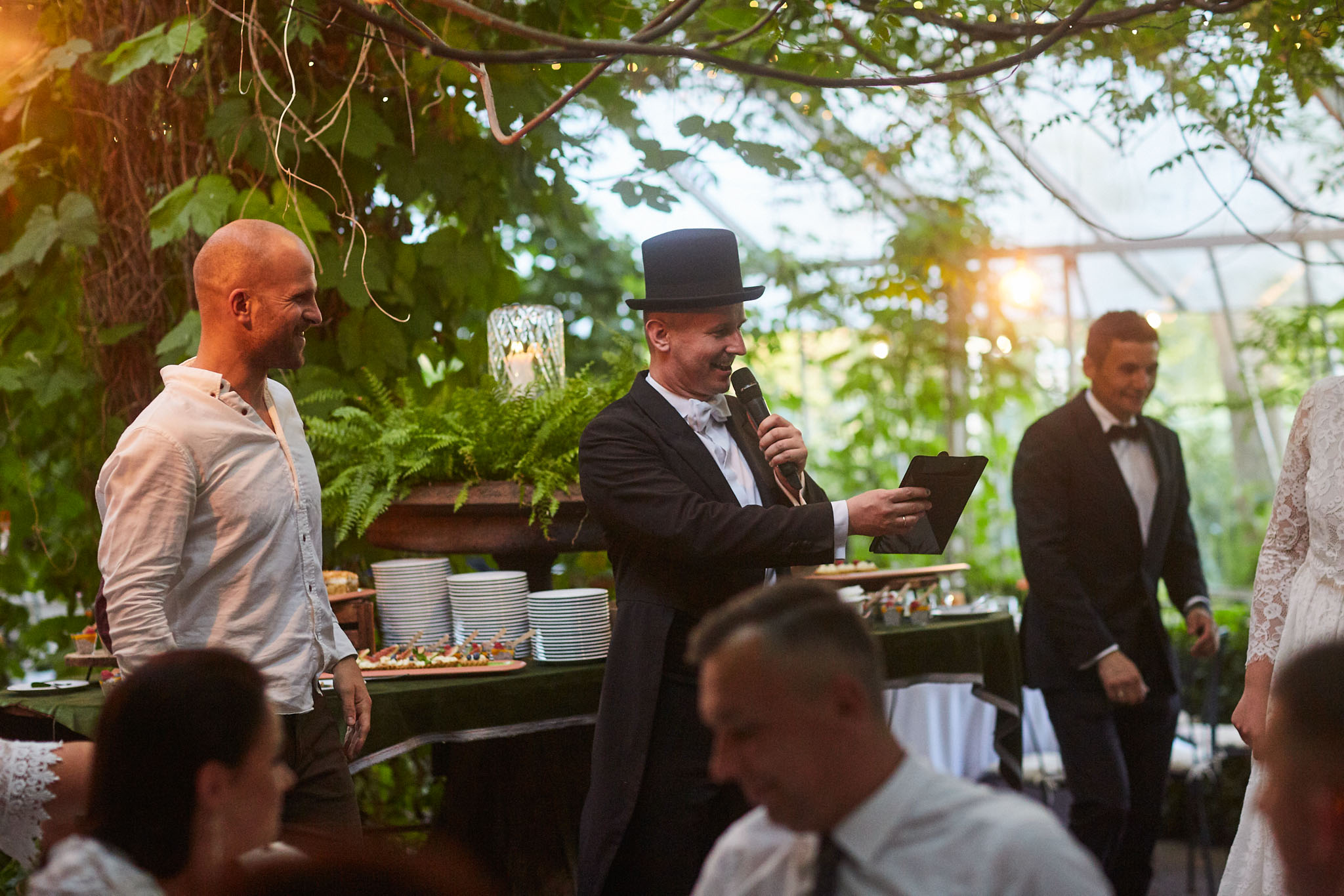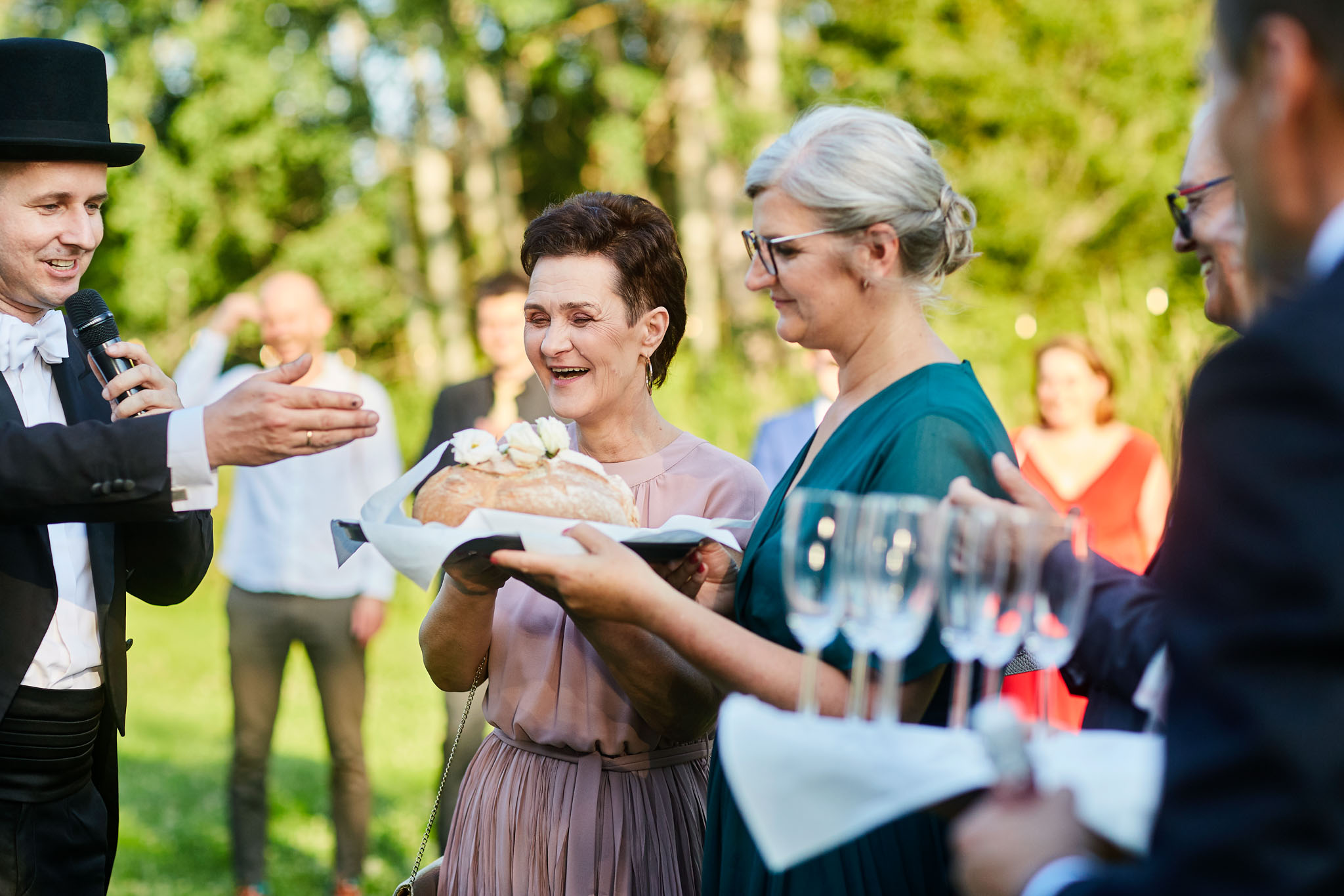 Stara Oranżeria to miejsce o niezwykle funkcjonalnym układzie – część taneczna jest oddzielona od strefy jadalnej, a tuż obok znajduje się piękny ogród z trawnikiem, który doskonale wkomponował się w przebieg wesela. Postanowiliśmy w pełni wykorzystać potencjał tej przestrzeni – nagłośniliśmy wszystkie strefy i płynnie przechodziliśmy z gośćmi między nimi, tworząc spójną, harmonijną całość. Ta forma prowadzenia wesela pozwoliła na jeszcze większą interakcję i zaangażowanie uczestników.