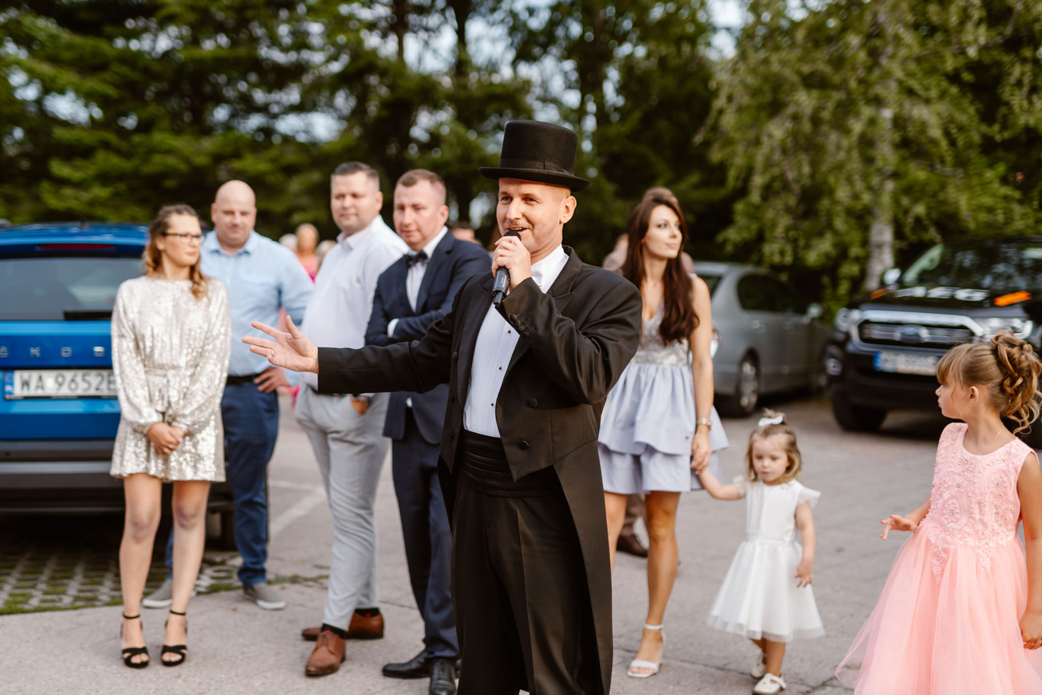 Wodzirej Karpik wśród gości weselnych przed salą
