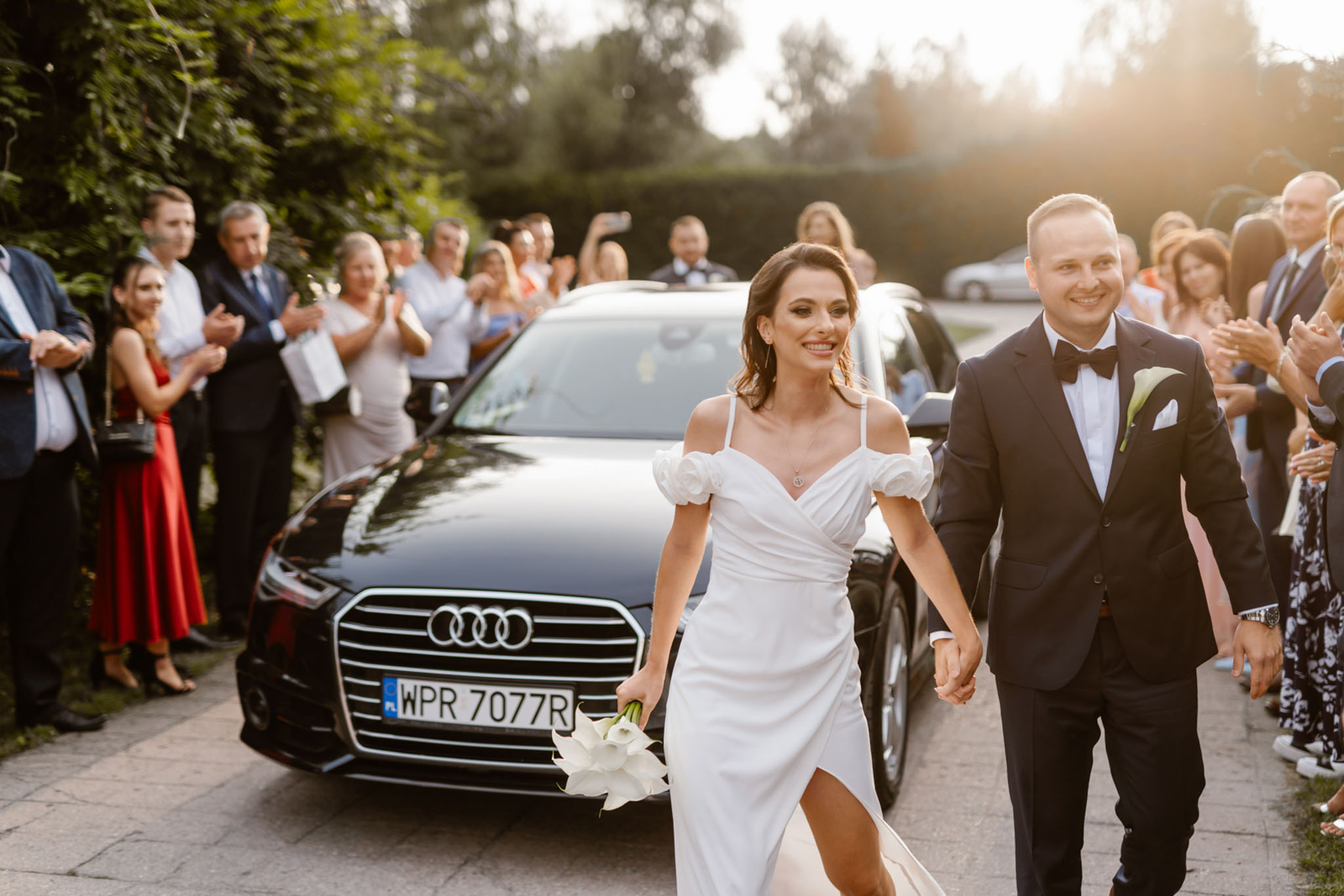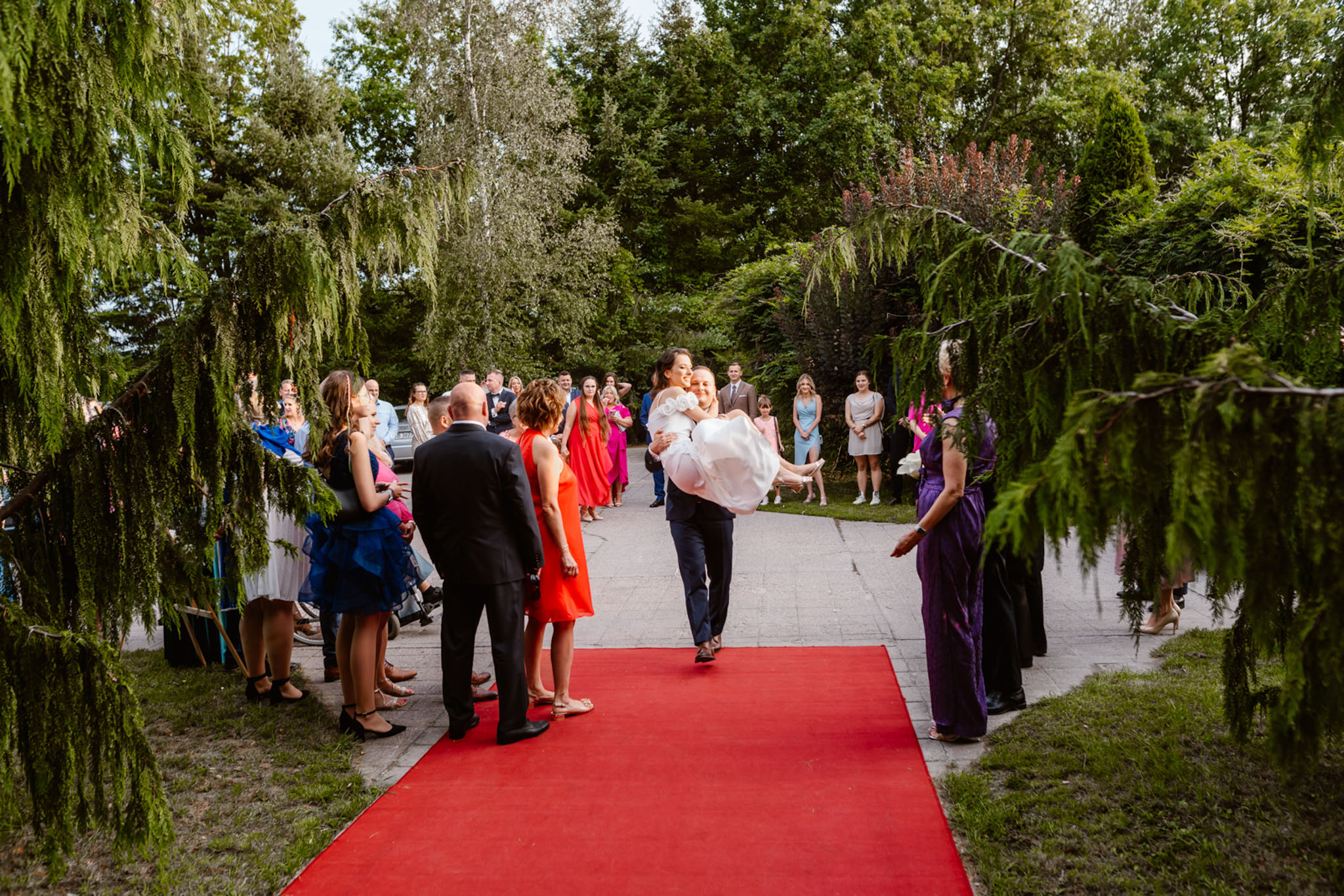 Ola i Sebastian to para, którą poznaliśmy jako gości na jednym z naszych wcześniejszych przyjęć. Tym bardziej jesteśmy zaszczyceni, że to właśnie do nas zwrócili się z prośbą o poprowadzenie ich własnego wesela. Od pierwszych chwil czuliśmy, że to będzie wyjątkowa noc – atmosfera była przyjacielska. Wspólne zdjęcie na świeżym powietrzu stało się idealnym momentem, by zgromadzić wszystkich gości w jednym miejscu. Tuż po tym, wspólnie ruszyliśmy krokiem poloneza, rozpoczynając przyjęcie. Taneczny początek dał ton całemu wieczorowi, który okazał się pełen luzu i spontaniczności.