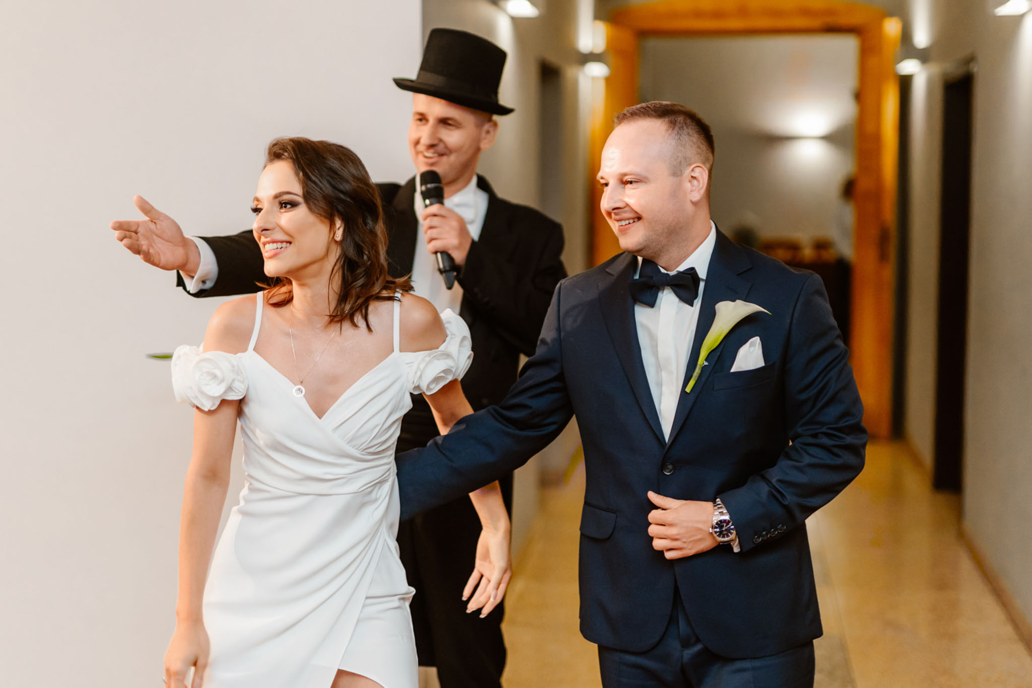 Polonez prowadzony przez wodzireja przed salą weselną jako integracyjne rozpoczęcie przyjęcia