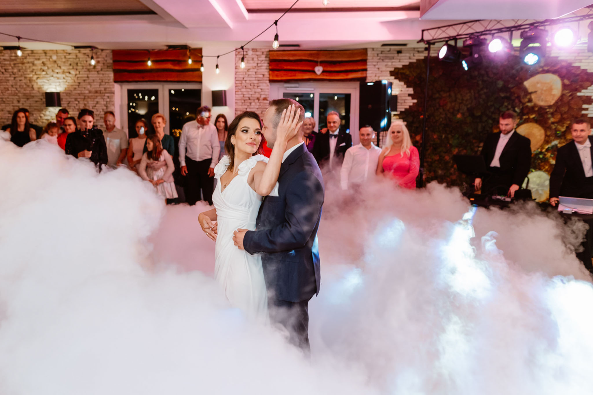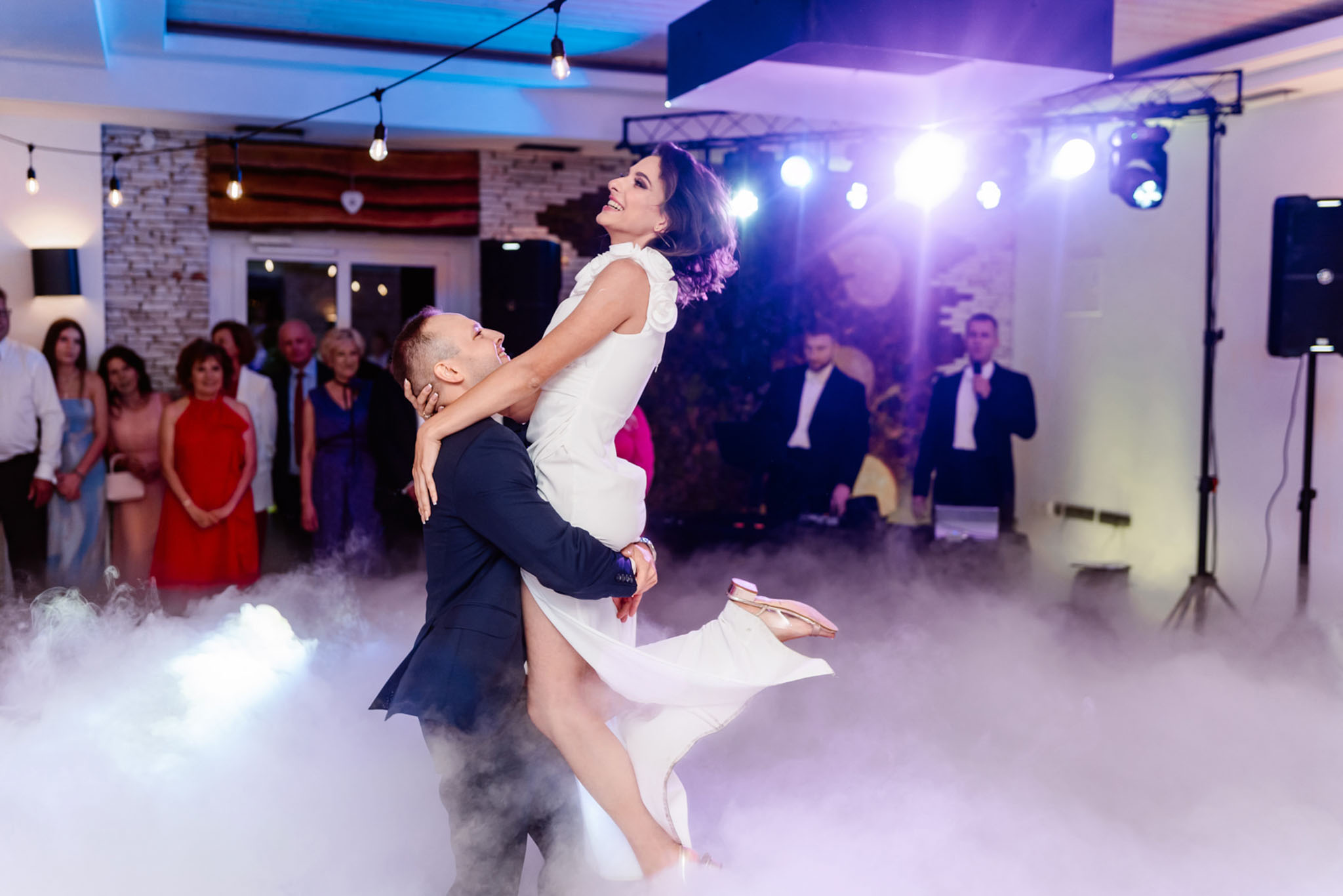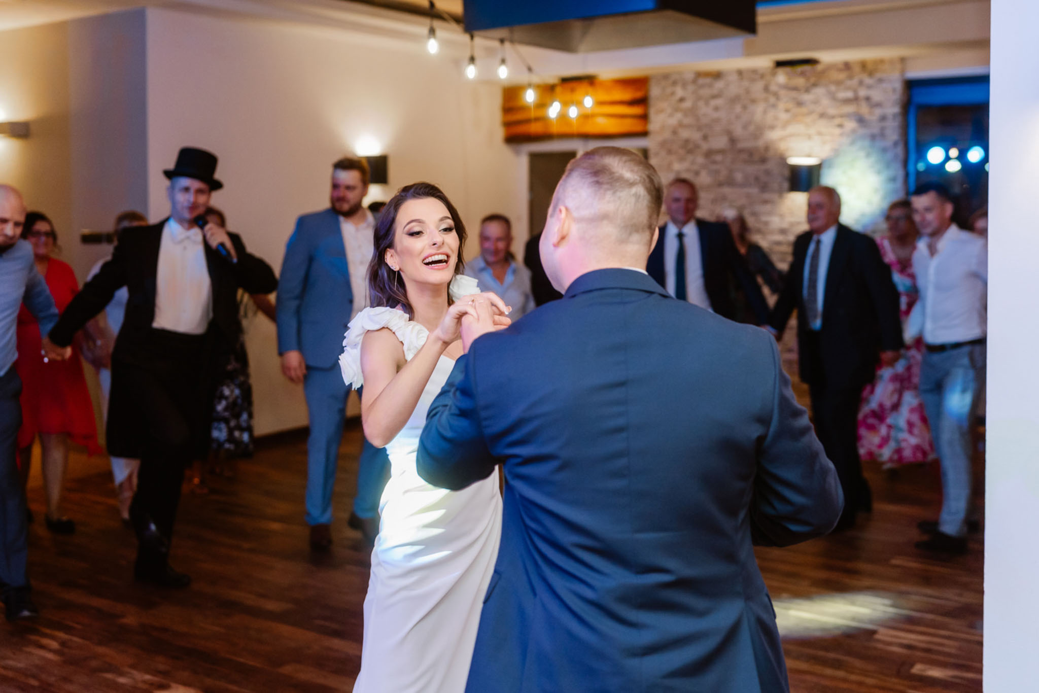 Para młoda tańczy na weselu z gośćmi.