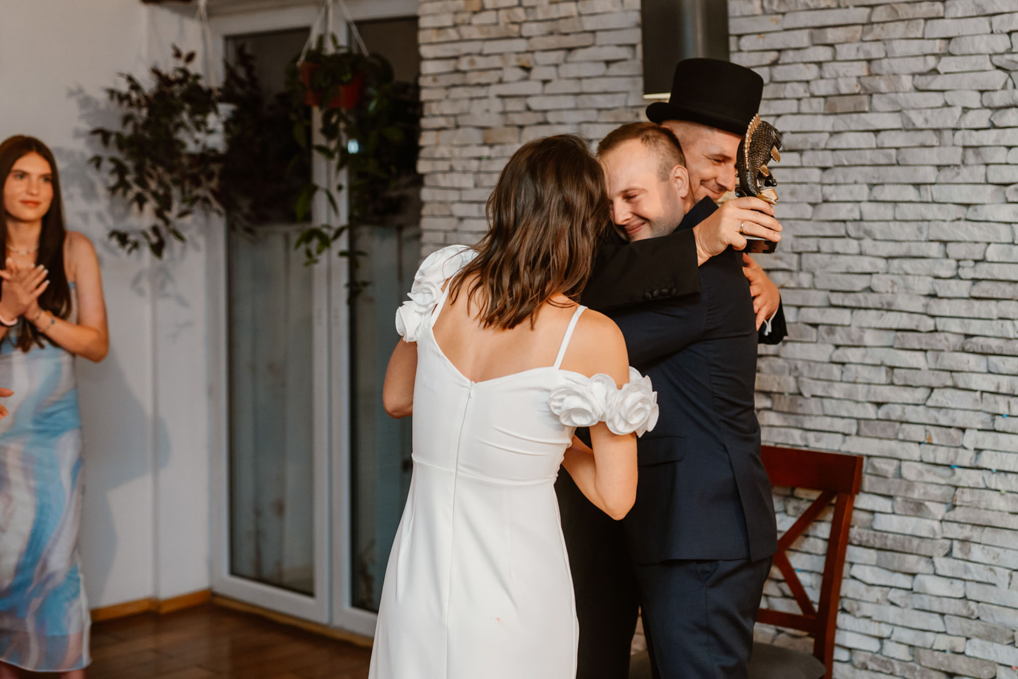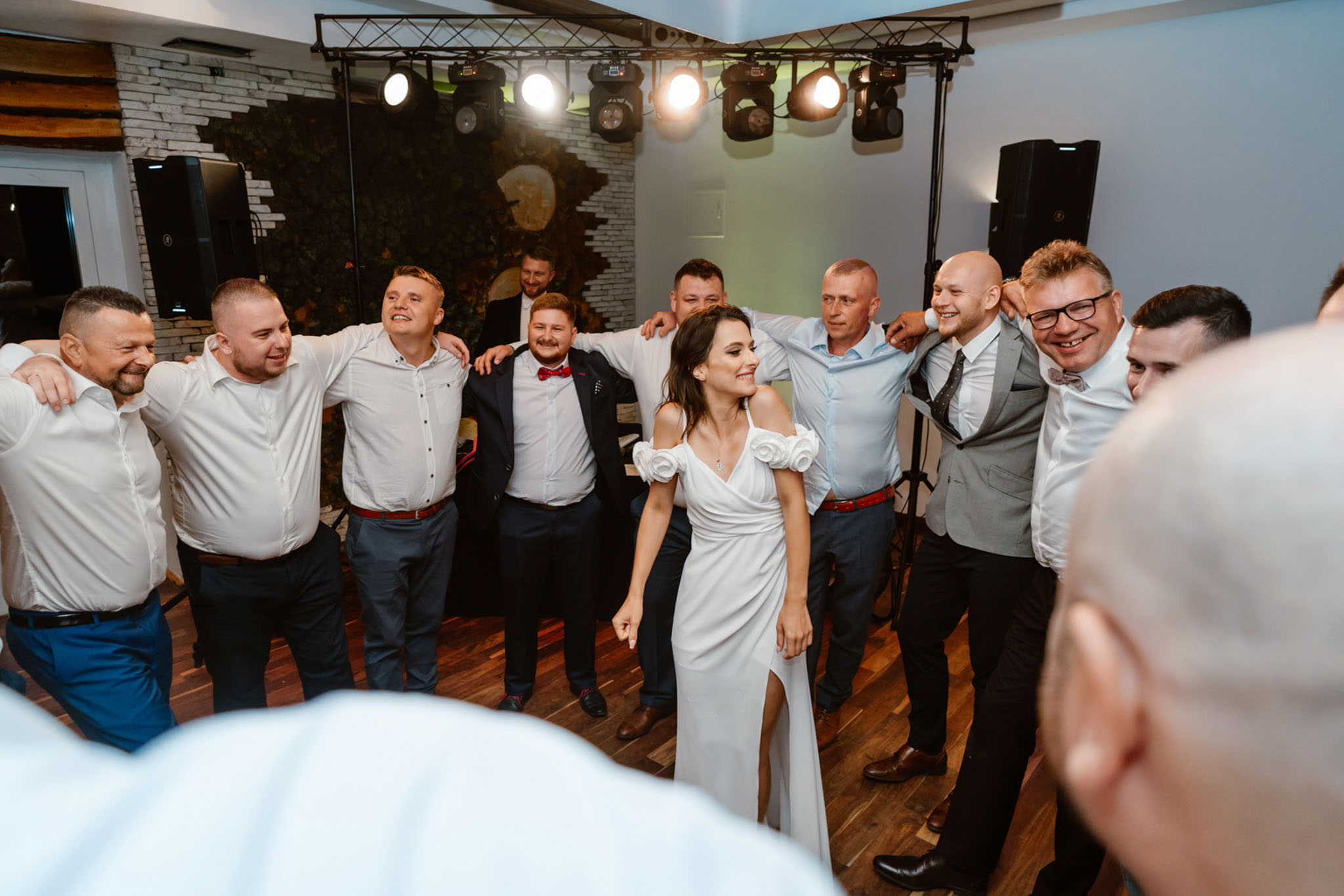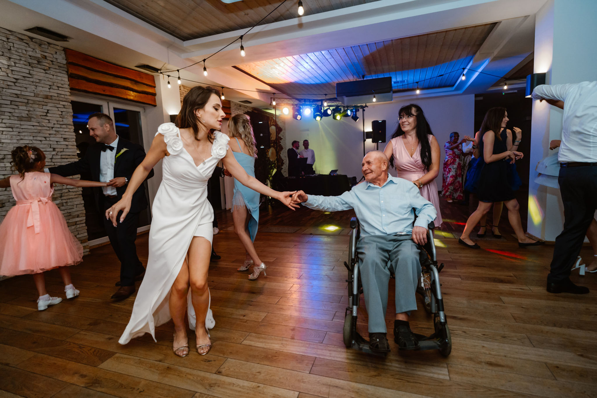 Para młoda tańczy na weselu z gośćmi.