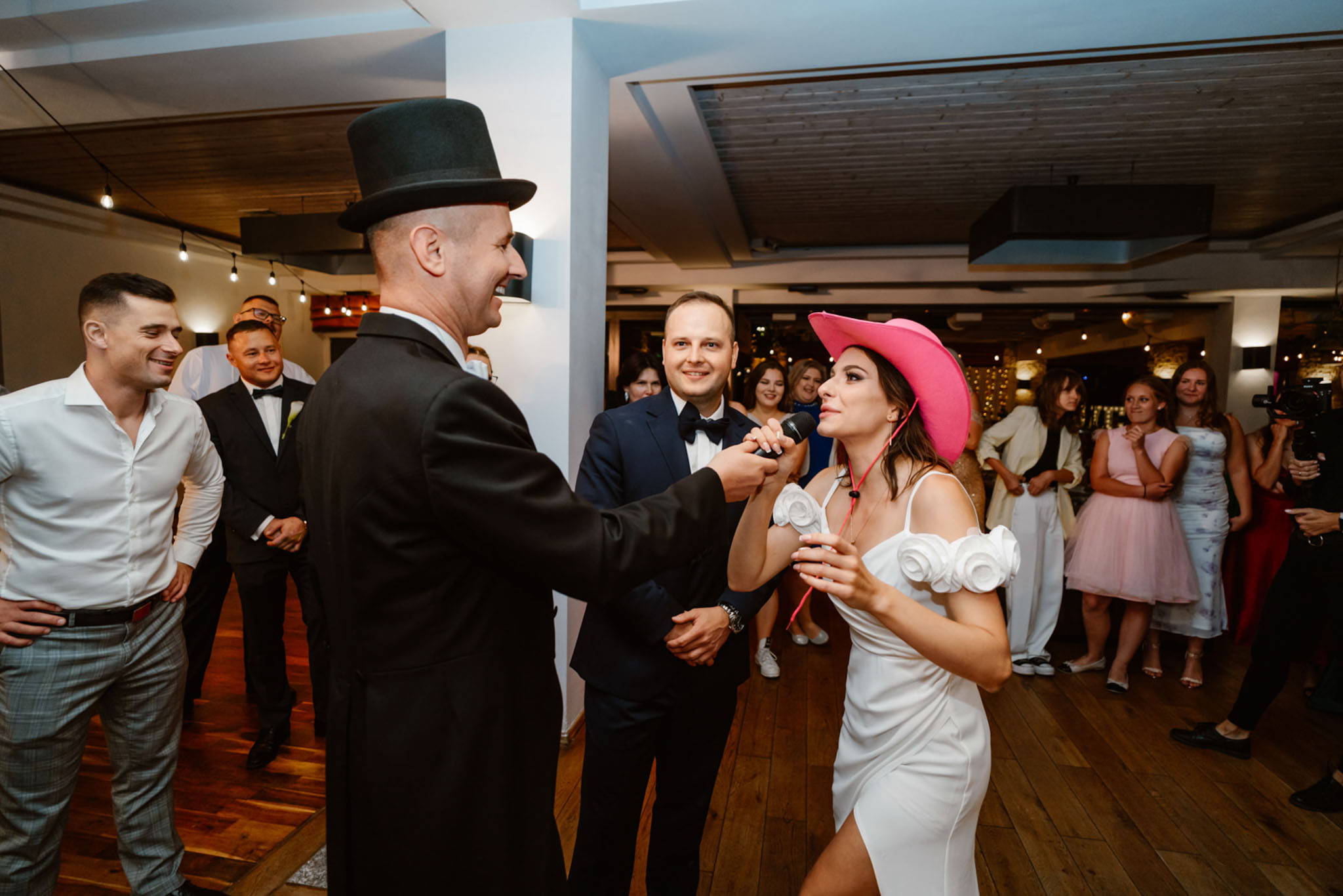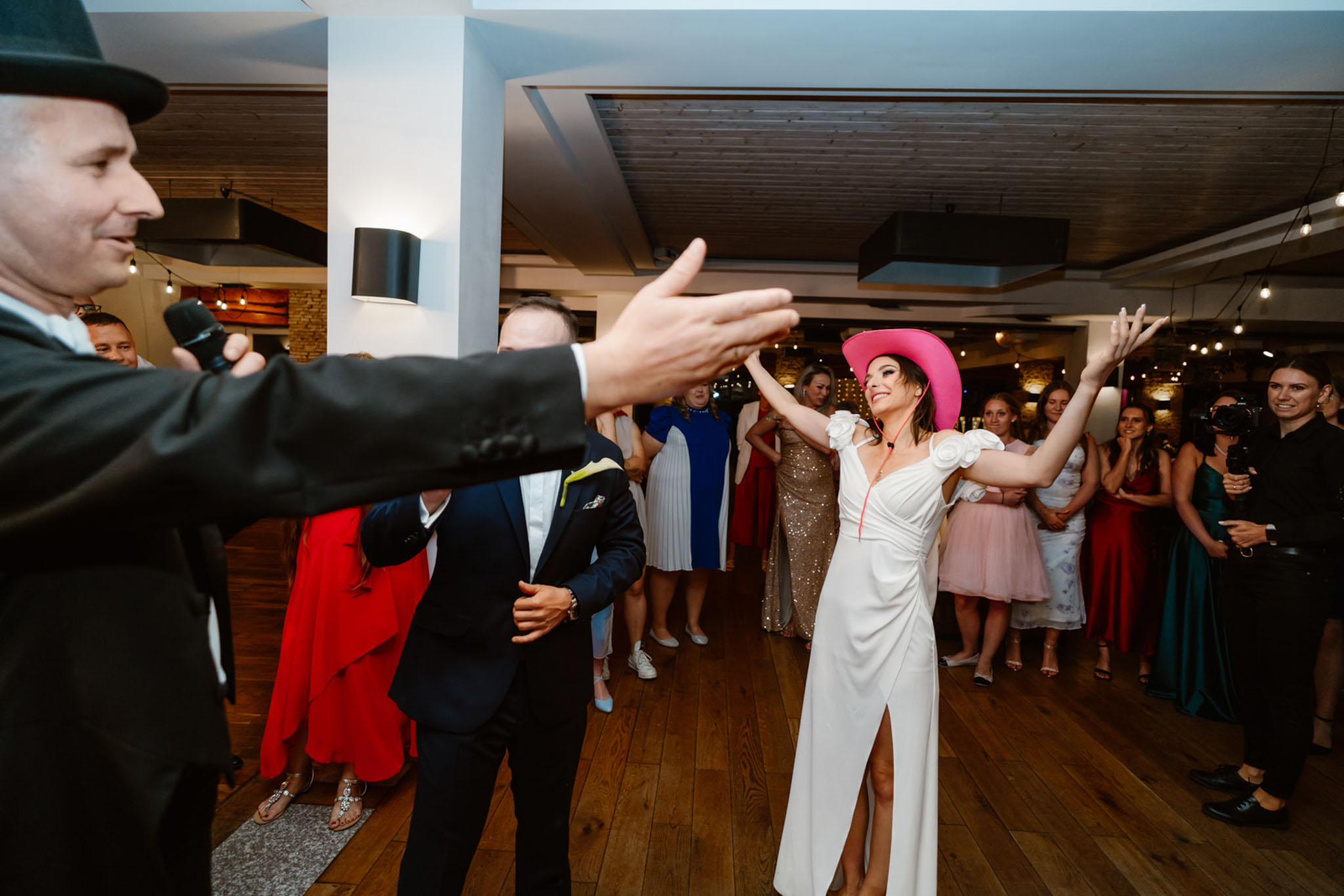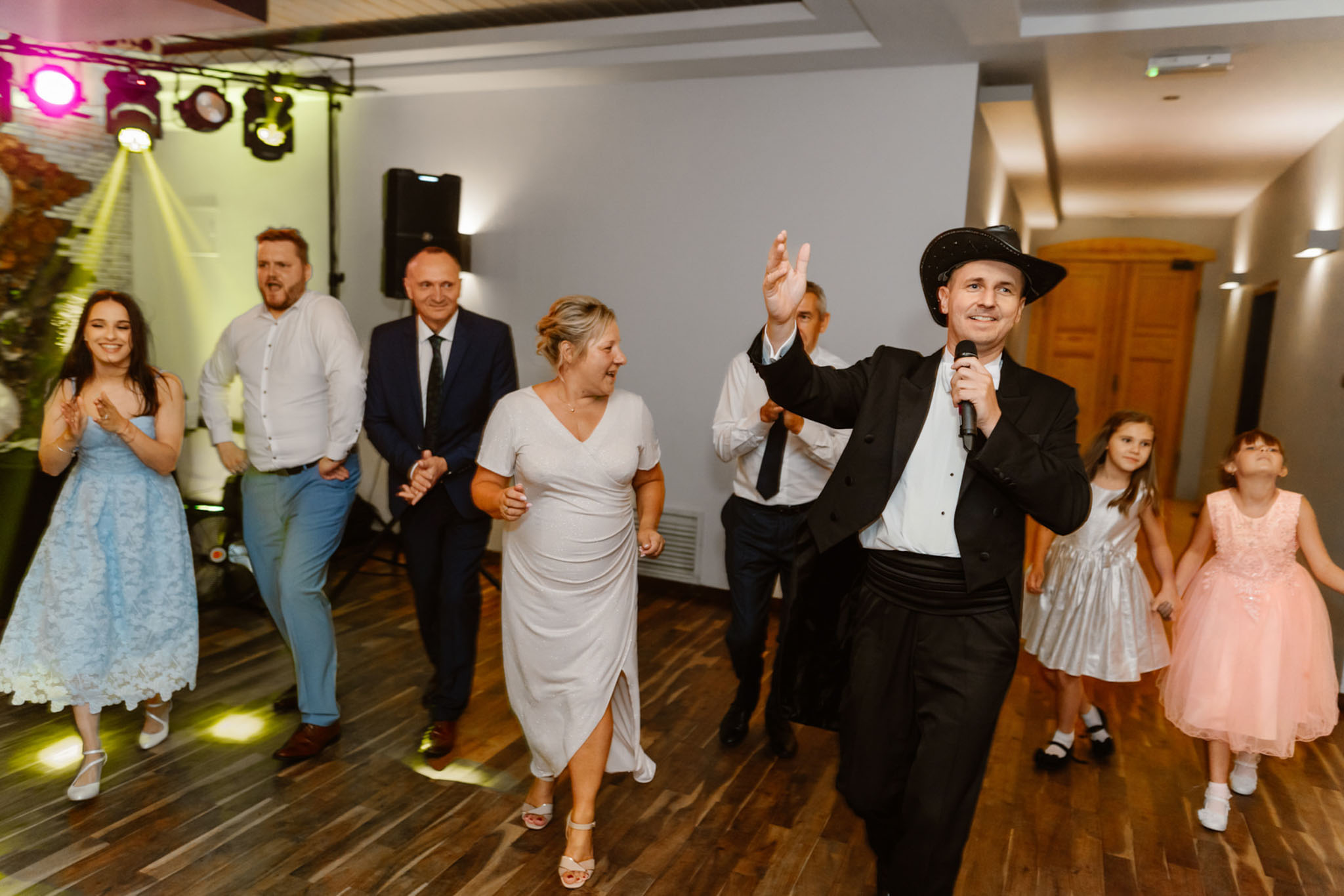 Wodzirej Karpik w kowbojskim kapeluszu prowadzący taniec na weselu