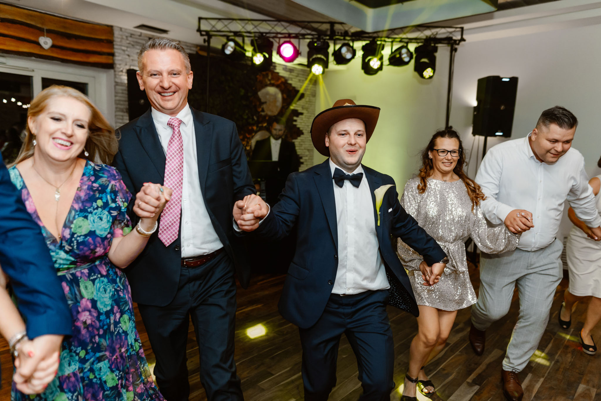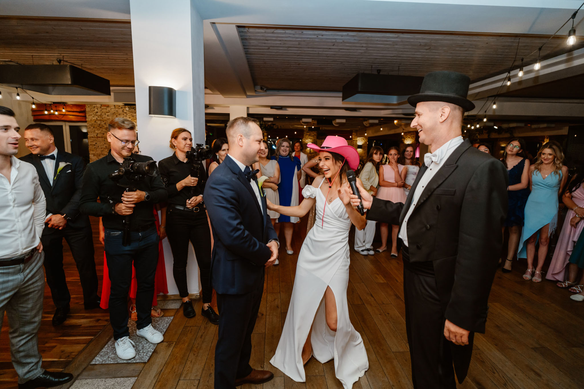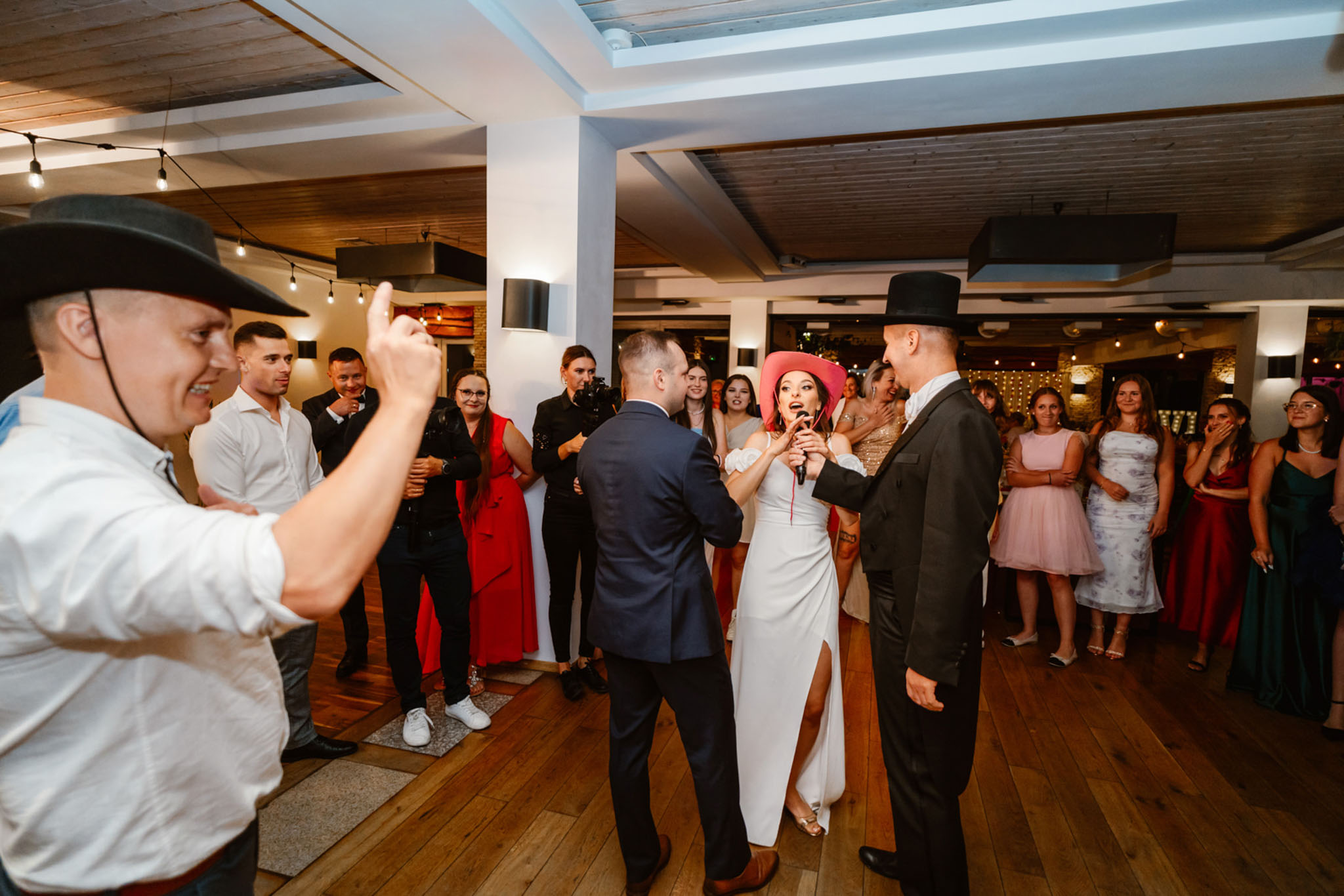 Wodzirej Karpik w kowbojskim kapeluszu prowadzący taniec na weselu