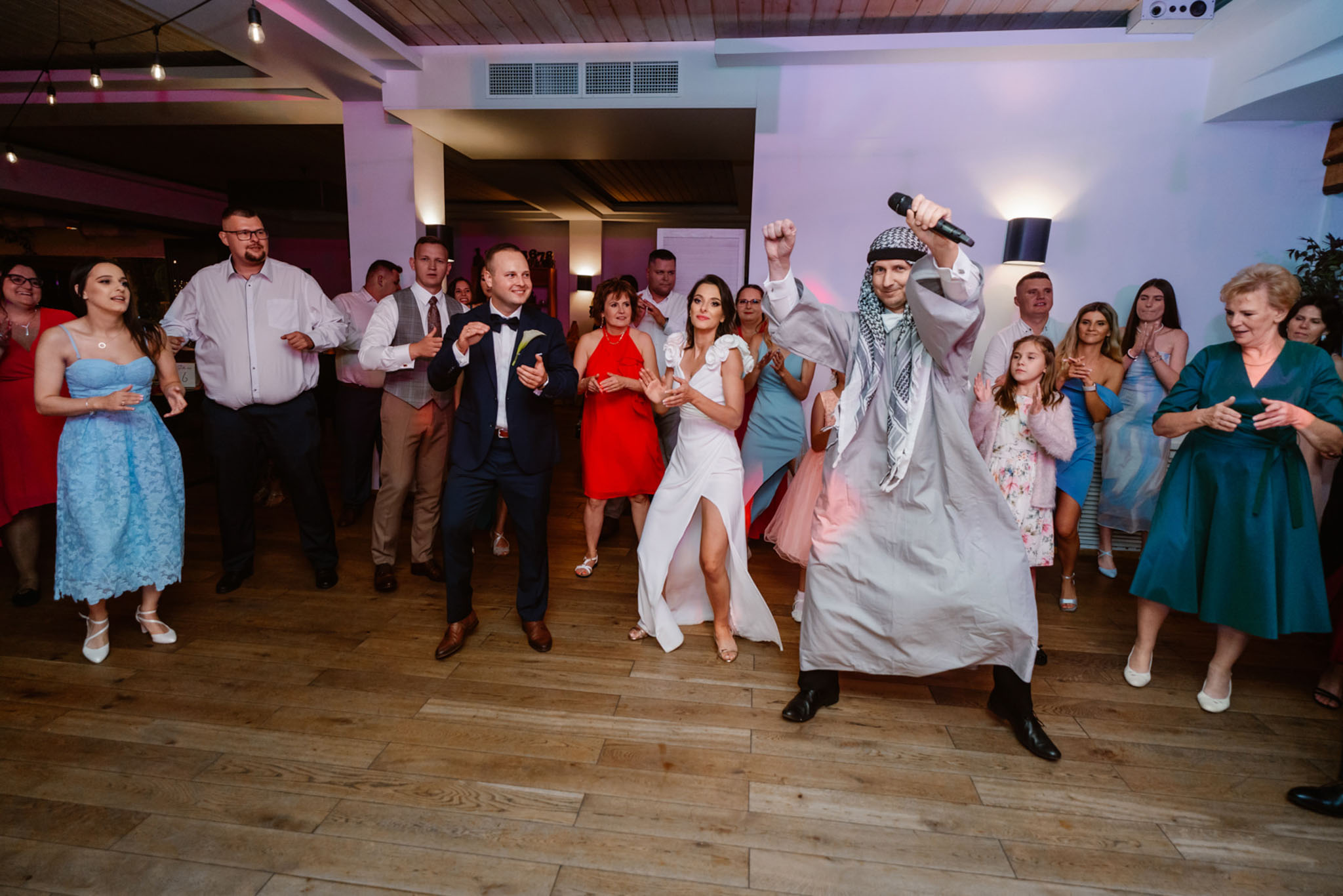 Wodzirej Karpik w stroju araba prowadzący taniec na weselu