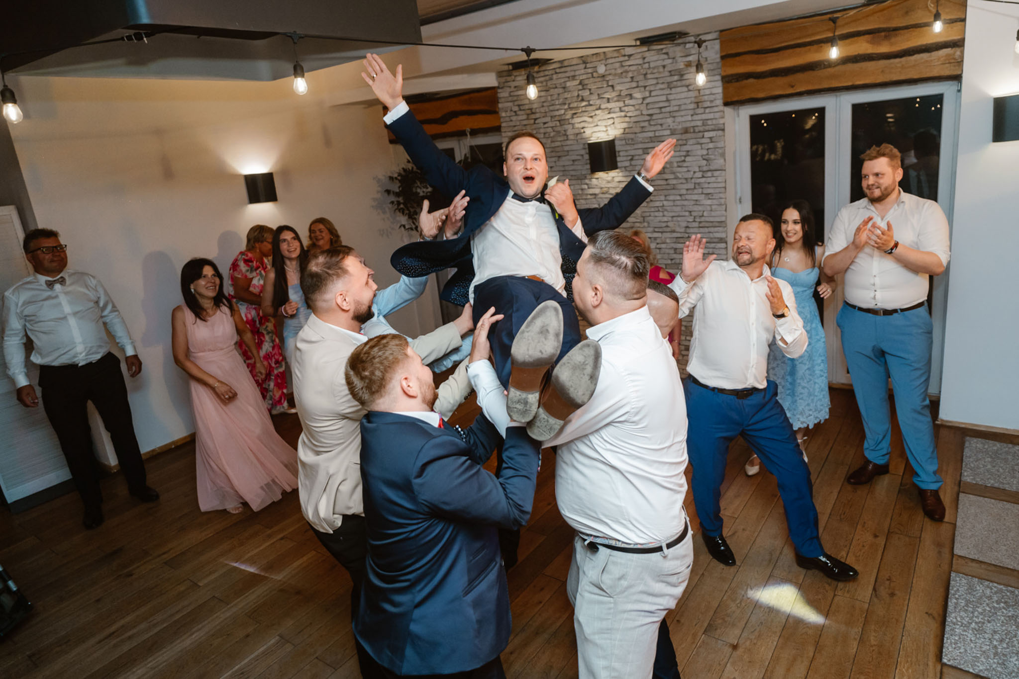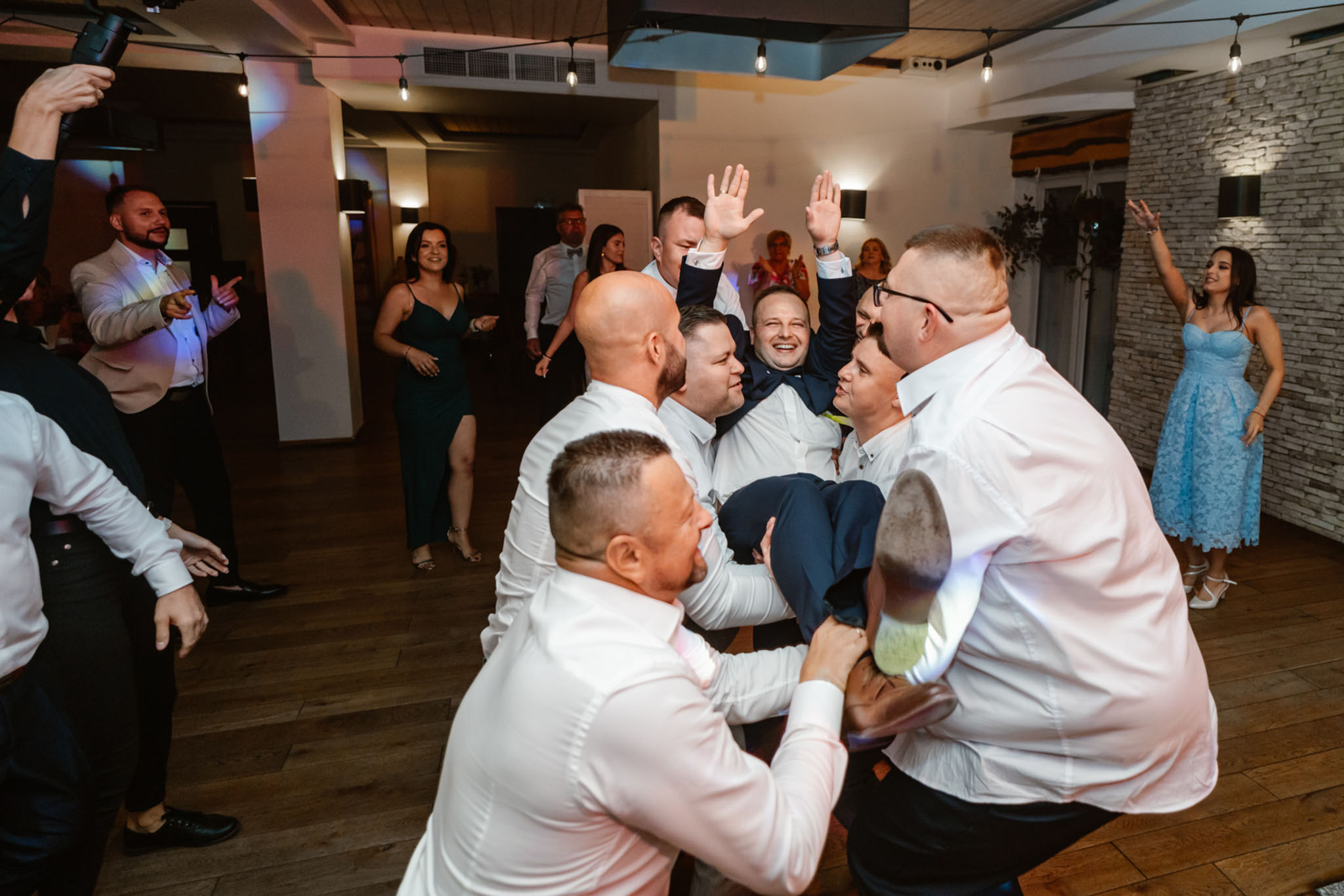Pan Młody podrzucany przez gości weselnych