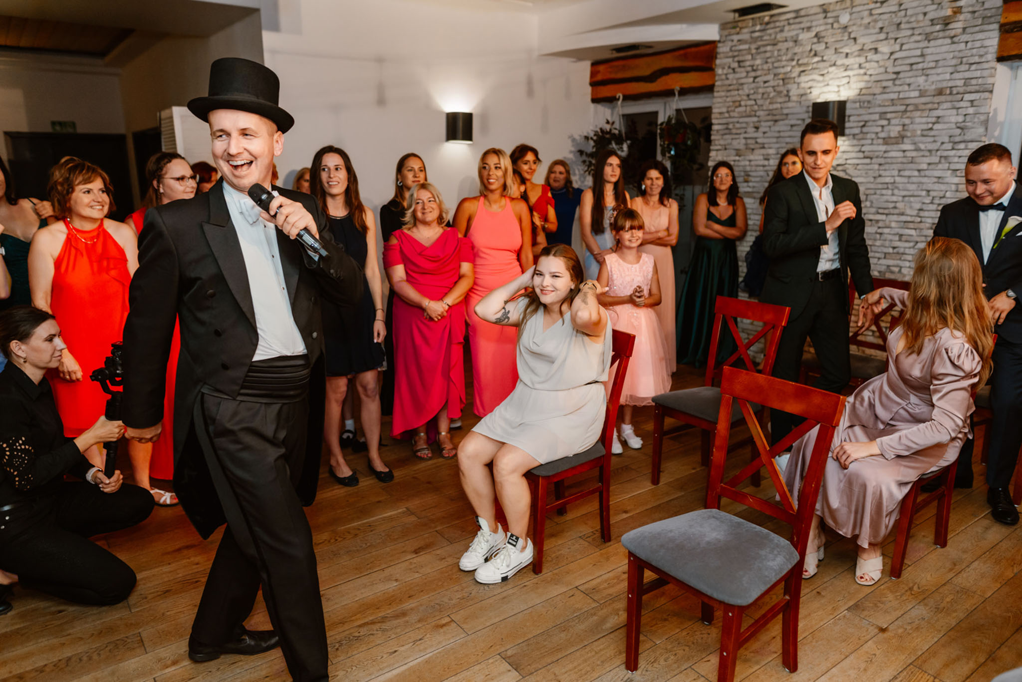 Wodzirej Karpik tańczący z gośćmi na weselu
