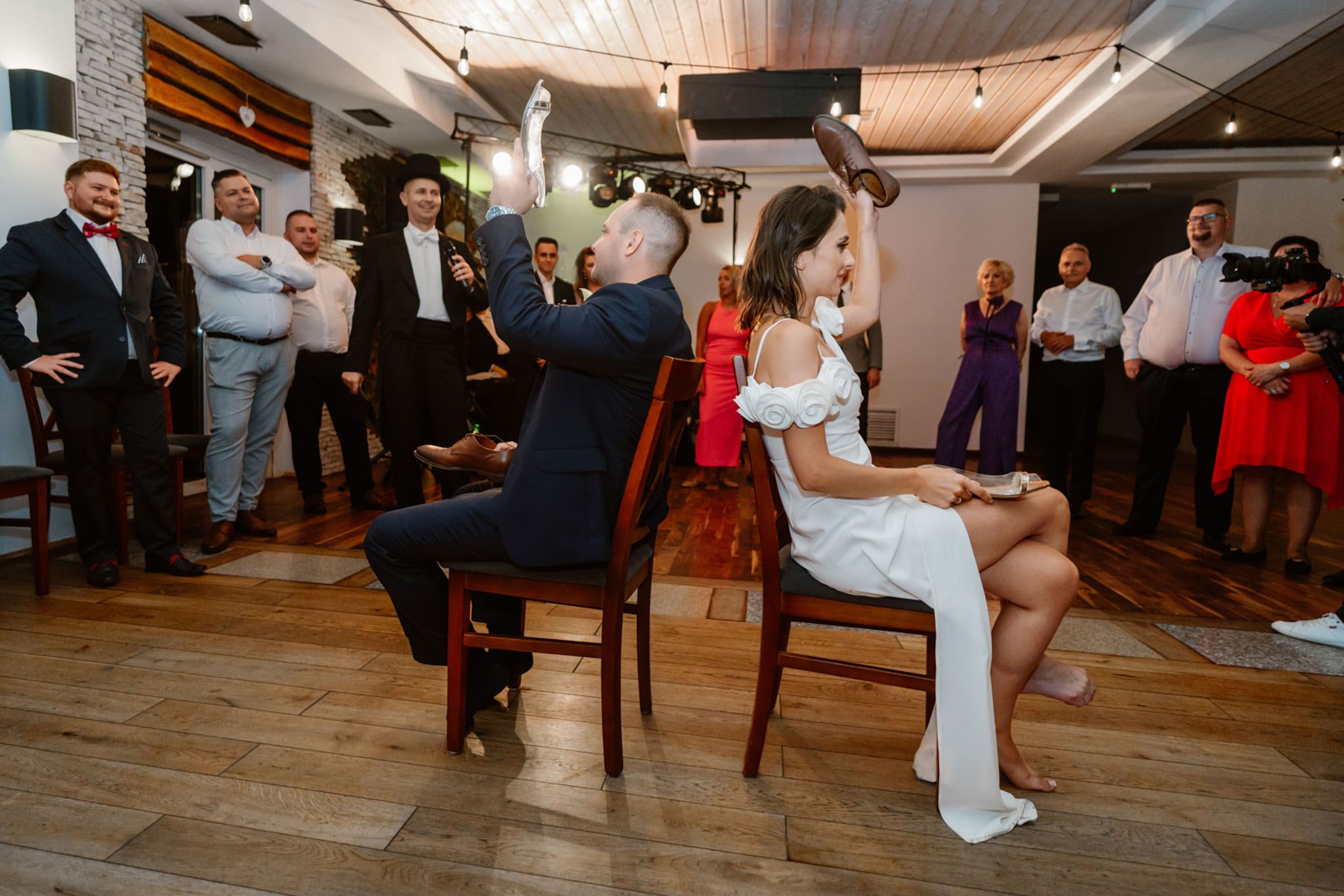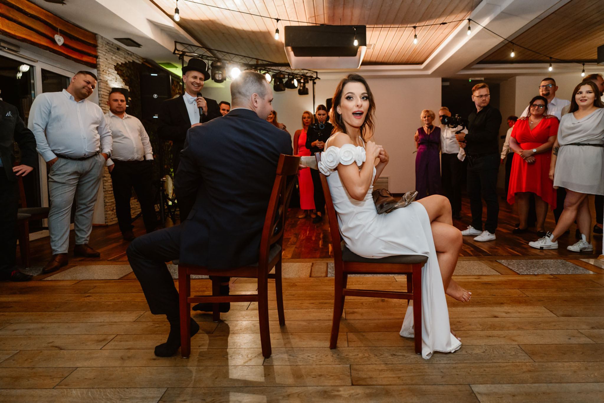 Państwo Młodzi podczas weselnych oczepin z wodzirejem Karpikiem