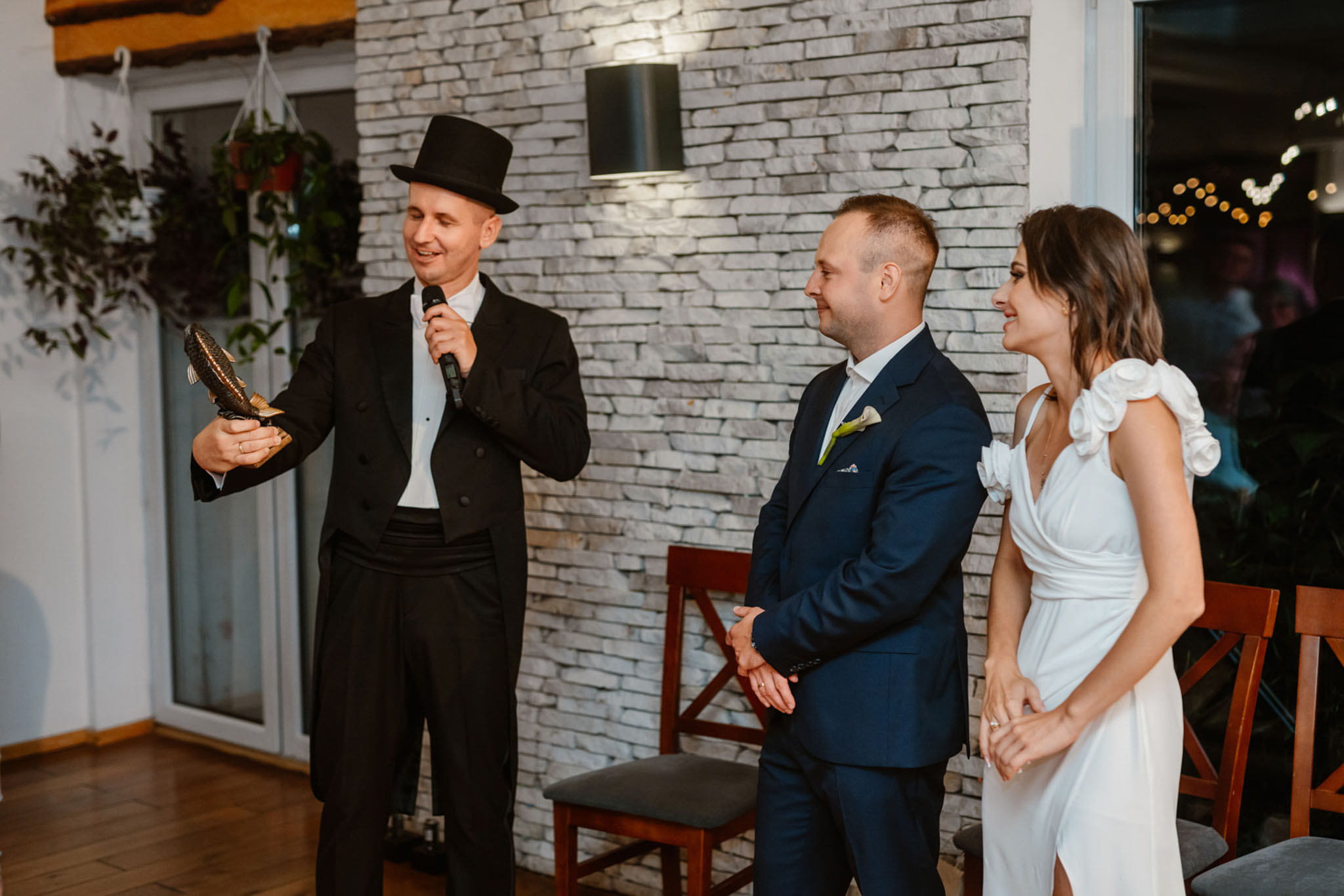Państwo Młodzi wręczający wodzirejowi Karpikowi statuetkę uznania w kształcie ryby